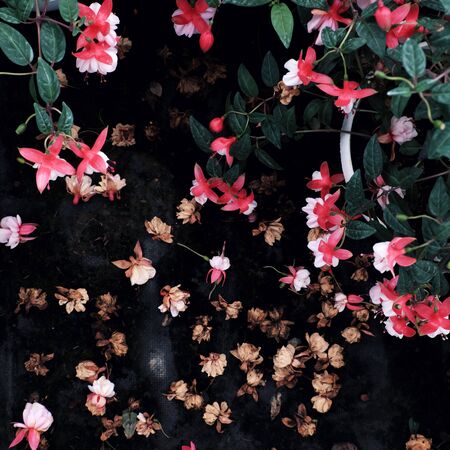 Hardy fuchsia flower blooming bright in pink and flowers fall on floor among green of ornamental plant in garden make contrast among fresh and dry flora