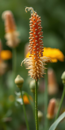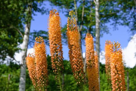 Unique orange flower blooms in a vibrant garden with green foliage during the summer season