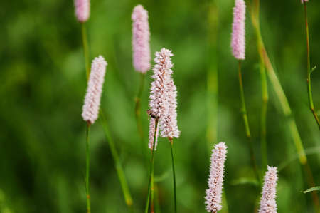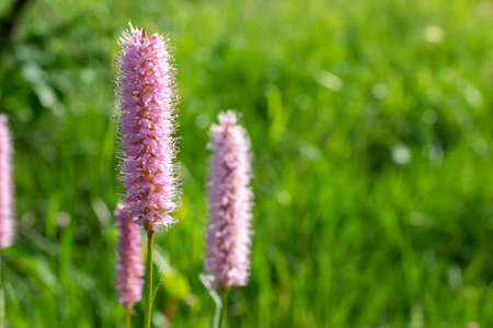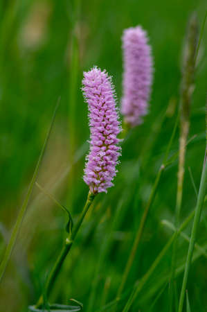 Bistorta officinalis meadow european bistort in bloom, pink meadow flowering snakeroot snakeweed plants in green grassland