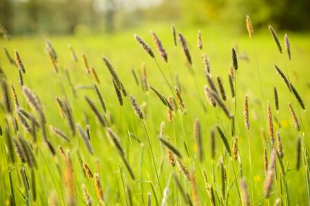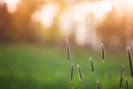 Beautiful summer landscape with field grass in sunset. Abstract nature background, sunny bokeh.