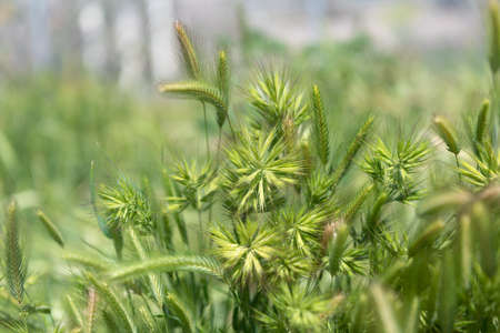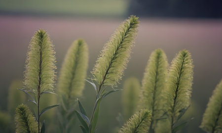 Yellow Foxtail grass seed with blurred background. Seedheads. Setaria glauca L.