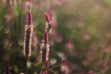Beautiful pink flowers in the meadow in the rays of the setting sun