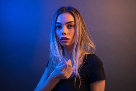 Sexy young blonde girl portrait over gray paper background in neon lights