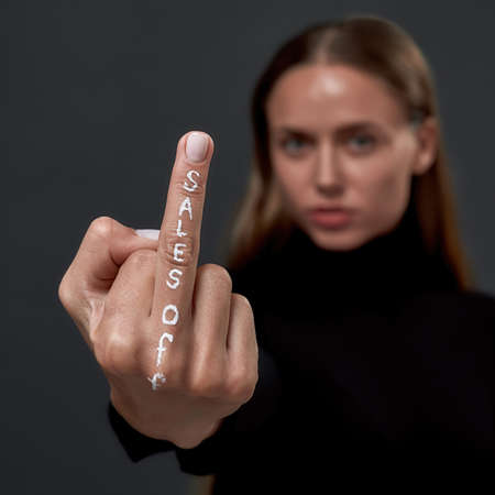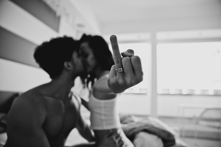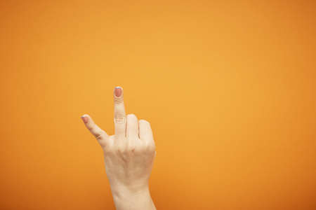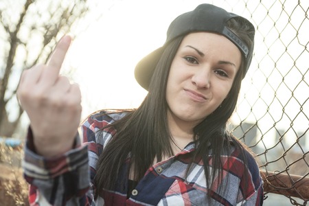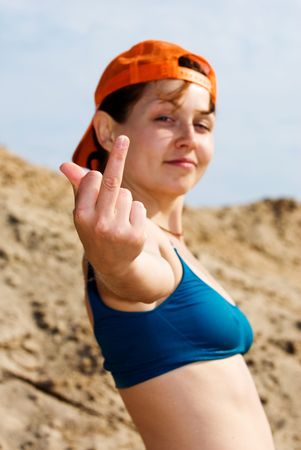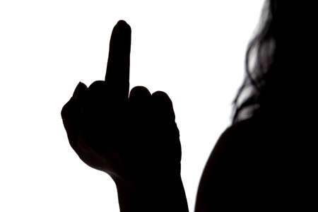 Pretty young girl showing a fuck sign over black background (focus is on the hand)