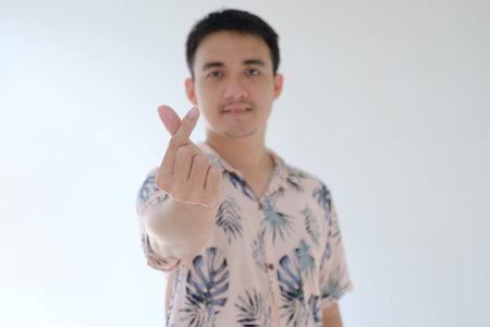 A young Asian man wearing a pink shirt with tropical patterns is posing as Saranghae usually known as finger heart. Focused on the finger. Unfocused face and body. Isolated white background.