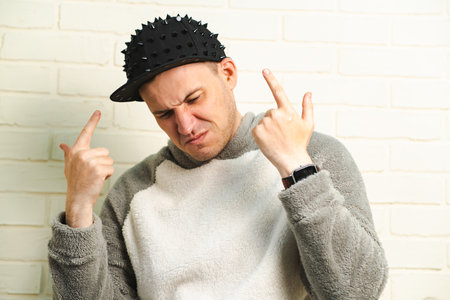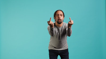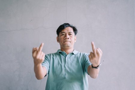 A Southeast Asian man making a gesture with his hands, perfect for emotional, rebellious, or edgy lifestyle projects