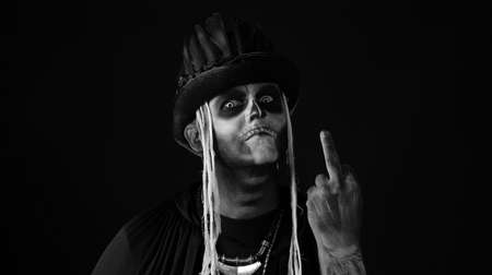 Sinister man with skull makeup making faces and showing middle finger. Bad manner gesture. Scary guy in thematic carnival costume of Halloween skeleton against dark black background. Black and white