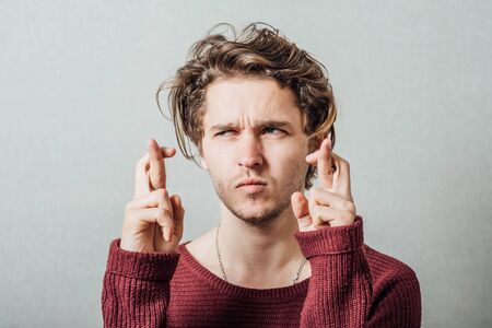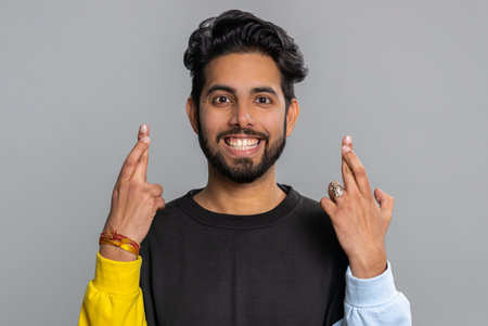 Indian young man crossed fingers looking at camera asking for good lucky news, wishing good exam results, dreaming about win victory in lottery jackpot. Hindu guy isolated on gray studio background