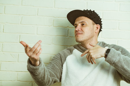 attractive candid european middle-aged male in hooded sweater with gesture - studio shot on black background
