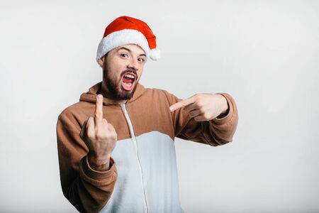 man dressed in pajamas i Christmas red hat show fuck you sign on white background for use to create image concept.