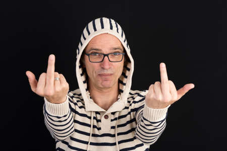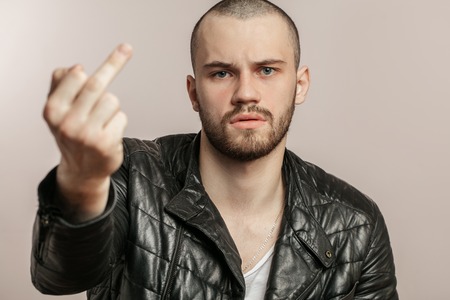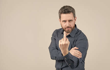 Flipping someone off. Bearded man show middle finger upwards. Obscene hand gesture. Finger
