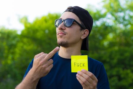 Young man showing 'fuck off' gesture while sitting on a bench during a sunny autumn day.