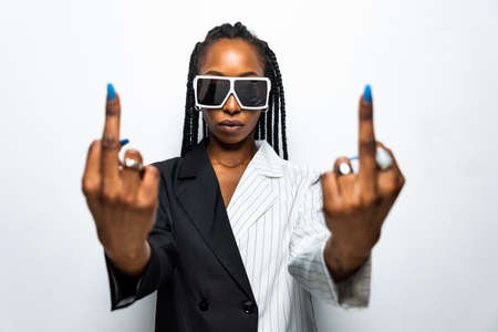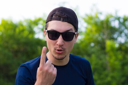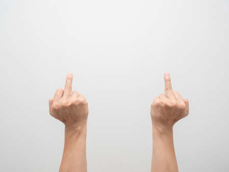 Portrait of a young man showing middle finger gesturing fuck isolated on white background