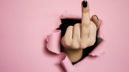 woman's hand broke a pink wall by pulling her finger. Fuck off
