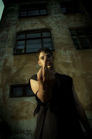 Angry man expressing abhorrence in dark backround. dramatic lights