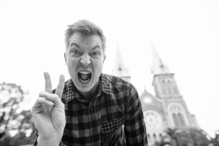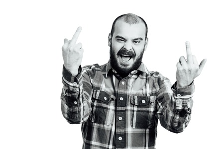 Portrait of a red-bearded, balding male brutal. White isolated background. A man in a plaid shirt two hands shows fuck and laughs. Black and white image.