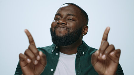 Portrait serious man showing cross hand rejection in studio. Closeup afro guy waving head no . Disappointed person showing negative gesture on grey background. African american man stop sign warning