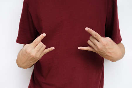 a man hands doing rock symbol wear rock style carmine T-shirt