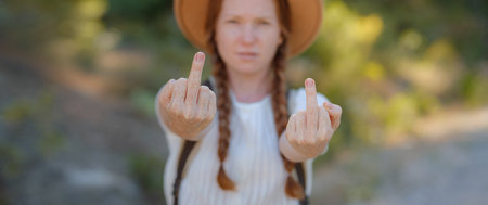 Caucasian ginger young beautiful female backpacker traveling alone in the forest. Attractive traveler woman showing middle finger doing fuck you bad expression, provocation and rude attitude. screaming excited