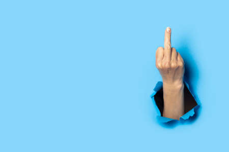 Hand shows the gesture of the middle finger on a blue background. Offensive gesture, fuck off, leave me alone.