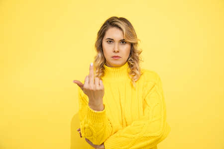Young pretty woman on yellow background showing middle finger - gesture of fuck. Expression negative, aggression, provocation.