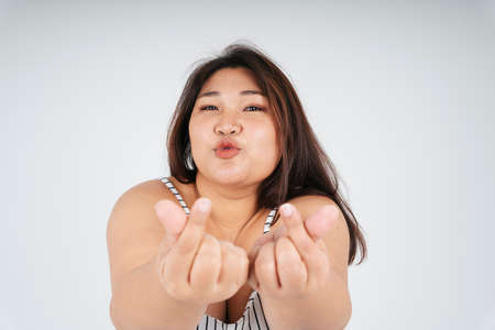 Portrait of healthy asian chubby woman with mini heart gesture on white background.