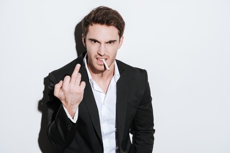 Image of agressive businessman posing at studio and look at camera while holding cigarette and showing middle finger. Isolated over white background.