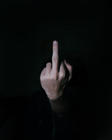 Hand, middle finger. Fuck you, symbol with green bokeh background