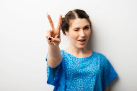 Young woman showing two fingers, positive or peace gesture, on white