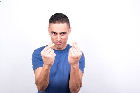 Man referring to money making a hand gesture. White background, medium shot