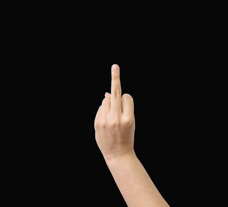 Hand showing fuck off with the middle finger. Isolated on a black background