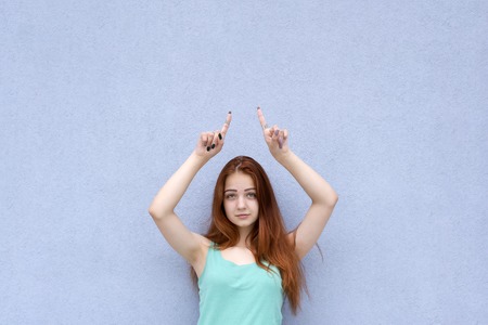 Young female with a finger up asking for attention, selective focus, studio shot