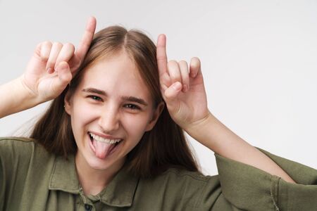 Photo of funny cute woman making horns with fingers and sticking out her tongue isolated over white background