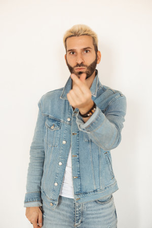Cool man. Masculine power. Successful lifestyle. Confident hipster guy in jeans jacket gesturing with hands isolated white copy space.