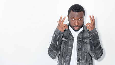 A man wearing a denim jacket is making a gesture, expressing a dynamic attitude and style