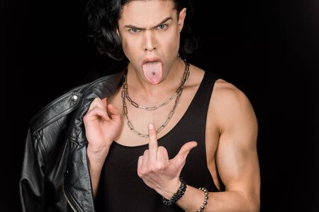 Man showing middle finger and tongue while holding leather jacket isolated on black background