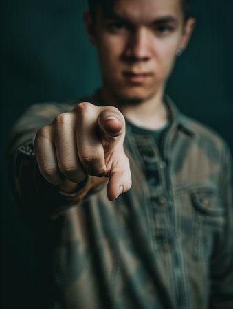 A young man points directly at the camera with a blurred background. The shallow depth of field focuses on the finger, adding intensity to the gesture