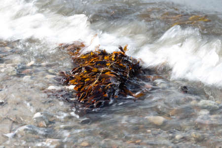 Kelp seaweed in shallow water. Laminaria on the stone beach. Close up image.