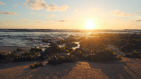 Sun over horizon and rolling ocean waves to the shore while sunset during tide. Beautiful natural landscape with water, sandy beach and green plants during low tide. Beautiful wild nature.