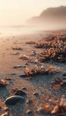 A tranquil beach scene at sunset featuring patches of seaweed on the sand. Soft sunlight reflects on the gentle waves, creating a serene atmosphere.