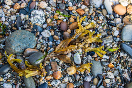 Seaweed on the beach of Atlantic ocean. Pebbles in the background. rea of Westfjords, Isafjordur, Iceland.
