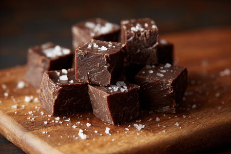 Fudge squares are arranged on a wooden board sprinkled with sea salt in a kitchen.