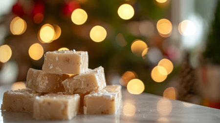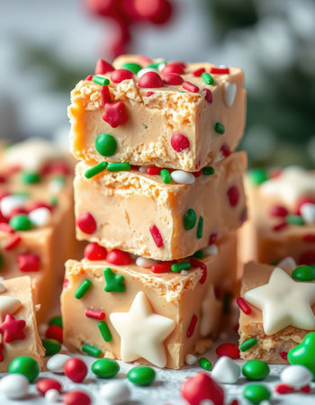 Festive holiday fudge stacked with colorful sprinkles and shaped candies in a winter setting