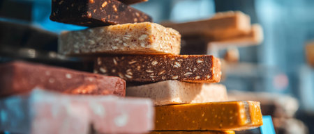 Healthy protein bars stacked in various flavors for fitness enthusiasts