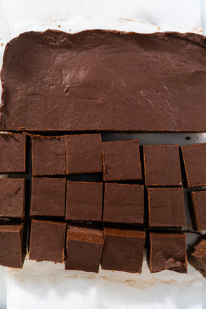 Vegan Chocolate Peanut Butter Fudge Dessert On White Background, Top View