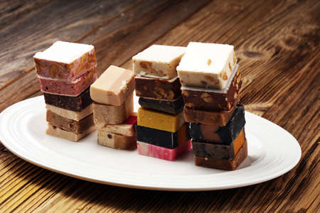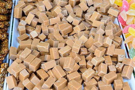 Heap of pieces of candy jelly sweets made of milk and sugar, in display on a table at a street food market, traditional food photographed with soft focus