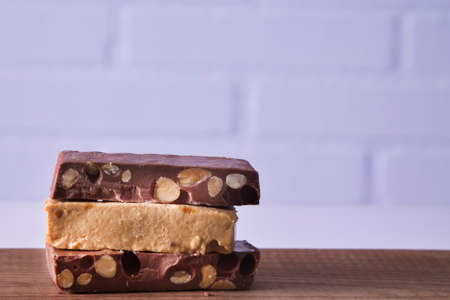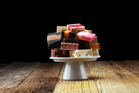 Delicious traditional Italian festive torrone or nougat with nuts on wooden background. Soft nougat blocks with almonds and in diffrent colors. Italian sweets.