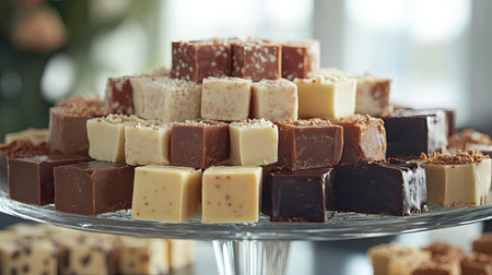 A stunning arrangement of assorted handmade fudge on a glass cake stand, showcasing various flavors and colors. Perfect for celebrations or gatherings.