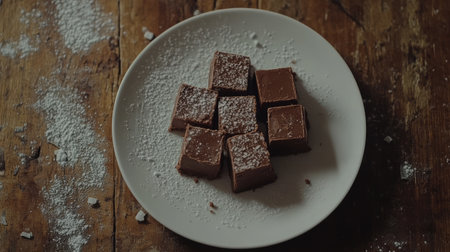 This enticing image features a plate of rich chocolate fudge dusted with powdered sugar, surrounded by a rustic wooden table. Perfect for sweet lovers!