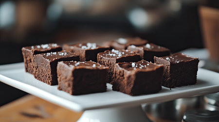 A tempting display of homemade chocolate brownies arranged neatly on a white cake stand. These rich brownies are topped with a sprinkle of sea salt, enhancing their decadent appeal. Perfect for any dessert table or celebration.